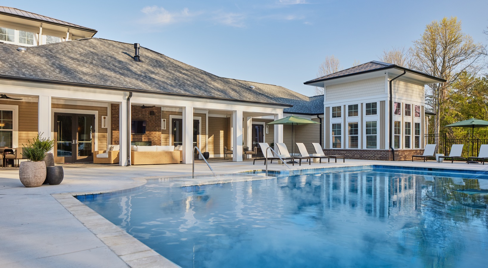 Pool and clubhouse with lounge chairs
